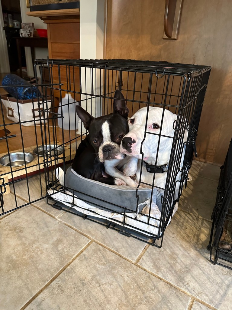 1 thought on “Both dogs decided to nap in Zeke’s tiny kennel today”