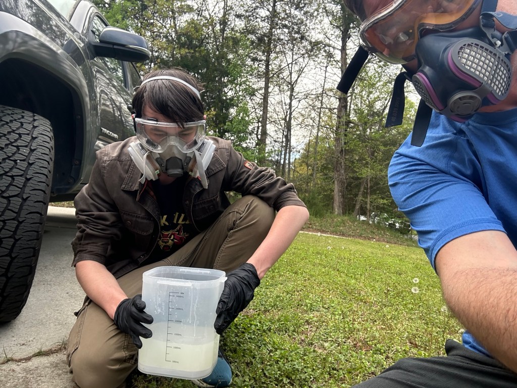 Max and I processing nasty stuff April 4, 2025 brookshouse1 Comment Four year old slurry of alcohol and semi-cured resin